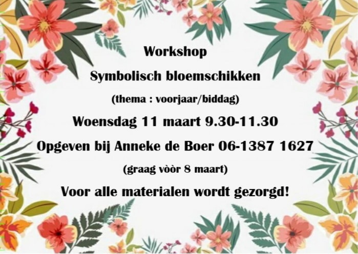 Workshop Symbolisch bloemschikken Op woensdag 11 maart is er een workshop symbolisch bloemschikken met als thema voorjaar/biddag. Deze wordt gegeven door Anneke de Boer van 9.30 tot 11.30 uur…